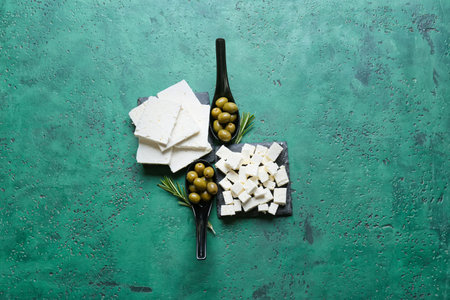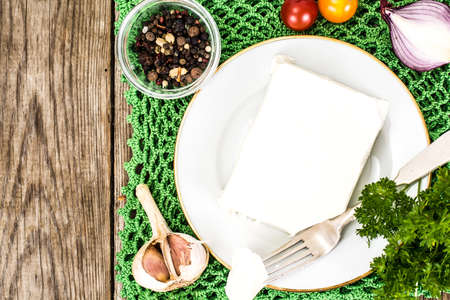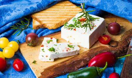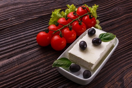 fresh greek feta cheese sandwich on wooden plate with hot green olives and black, goat cube, tomatoes kale over table