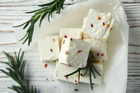 Traditional Caucasian homemade Cheese Brinza with rosemary on wood background