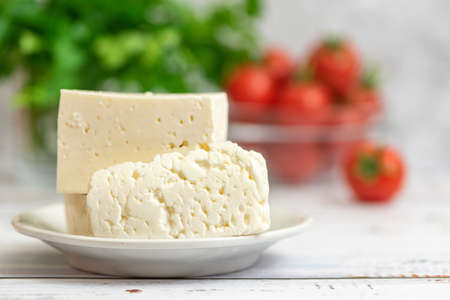 Large pieces of feta cheese in white plate and cherry tomatoes on light background. Selective focus, High key.