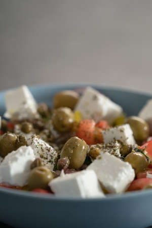 Classic greek salad in blue bowl on concrete countertp with copy space, shallow focus