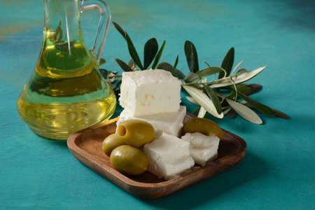 Feta cheese with green olives, olive oil, and young olive branch. Fresh Greek Feta Cheese. Healthy ingredient for cooking salad.