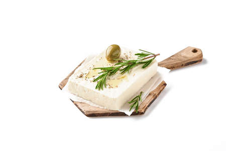 Cheese feta with rosemary, herbs and olive oil on wooden cutting board isolated on white background. Traditional Greek homemade cheese. Selective focus.