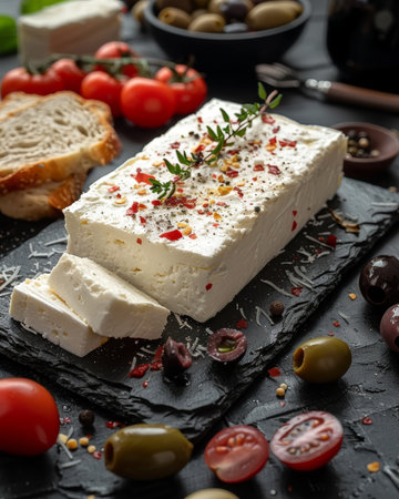 Close-up of sliced feta cheese with a sprinkle of fresh herbs and a drizzle of olive oil on a dark stone background, creating a rustic breakfast setting