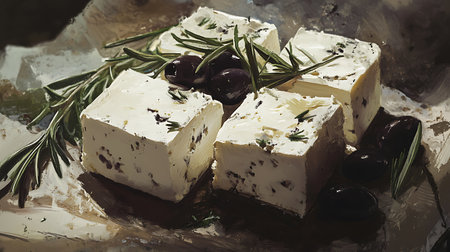 Square blocks of fresh feta with rosemary sprigs and shiny black olives are displayed, reflecting culinary artistry.