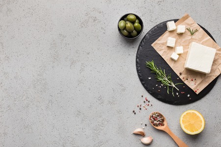 Feta cheese, and black olives on cutting board background. Fresh ingredients for greece salad or Italian pasta. Overhead view, close-up