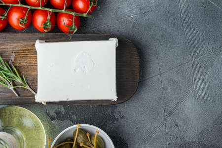 Ingredients for traditional greek salad set, on gray background, flat lay with copy space for text