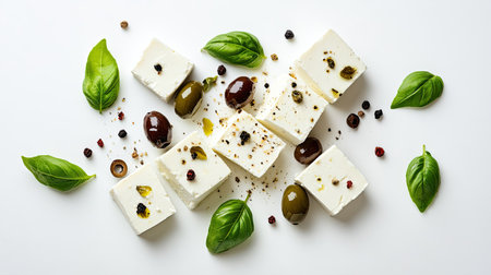 An assortment of feta cheese slices with whole olives and basil leaves, perfectly arranged on a white background with full depth of field for clear details