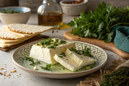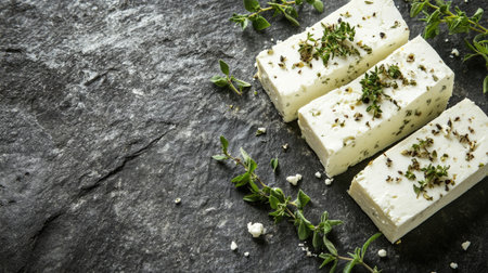 Freshly sliced feta cheese with a sprinkling of dried oregano and fresh thyme, set on a cool stone background to highlight a Mediterranean breakfast vibe