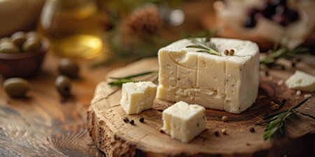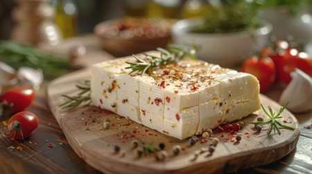 Close-up of feta cheese cube, garnished with fresh rosemary, resting on a round wooden board. Culinary still life showcasing rustic, natural flavors.