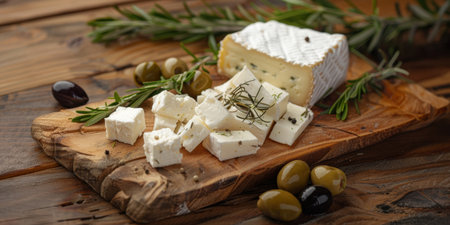 Gourmet feta cheese adorned with basil leaves and black olives, set on a rustic wooden board for a Mediterranean dish