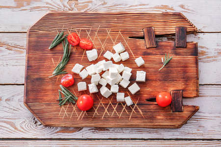 Cheese feta with rosemary, herbs, cherry tomatoes, olives and olive oil on wooden cutting board on white old wooden background. Traditional Greek homemade cheese. Selective focus.