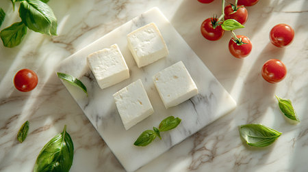 Blocks of white cheese on a marble cutting board with fresh basil and cherry tomatoes, top view, soft lighting