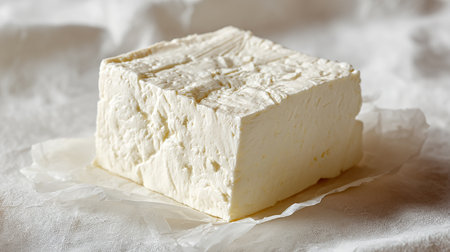 A cube of feta cheese with a crumbly texture sits alone on a smooth, light surface, showcasing its rich white color and appealing shape under soft lighting.
