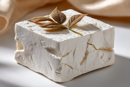 Soft cheese block with knife marks showcased against white background. Minimalist artistic style adds to clean aesthetic. Concept of culinary art, gourmet food, restaurant presentation.