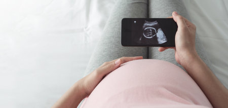 Female waiting her baby, Pregnant woman looking her ultrasound scan photo on Smartphone. Concept of pregnancy, Maternity prenatal care.