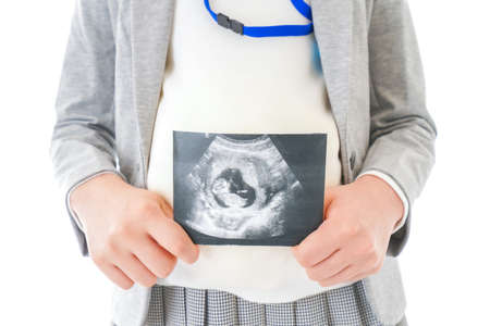 A pregnant woman is looking at an ultrasound photo of fetus. Mother gently touches the baby on stomach.Women are pregnant for 2-3 days or during the first trimester.