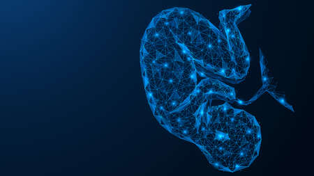 An embryo in the womb. Female pregnancy. Polygonal design of interconnected lines and points. Blue background.
