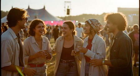 A vibrant crowd enjoys a summer music festival. People are smiling, cheering, and enjoying the live performance in a festive and energetic atmosphere.