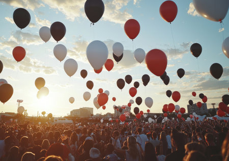 Celebration event with colorful balloons outdoor festival crowd gathering sunset view joyful atmosphere