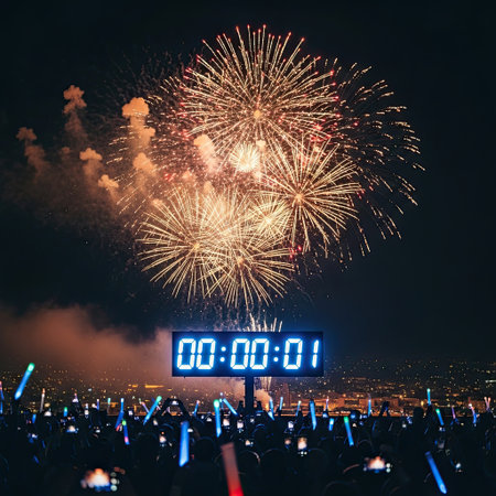 Colorful and bright new year countdown music concert with large crowds and fireworks