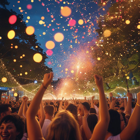 A lively outdoor music festival featuring a jubilant crowd celebrating with vibrant confetti. The scene captures the joy and excitement in a summer atmosphere.