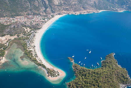 Oludeniz beach aerial panoramic view. Oludeniz or Blue Lagoon is a beach resort in the Fethiye district of Mugla Province, Turkey. High quality photo