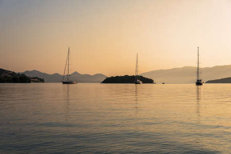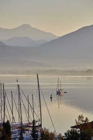 Sunrise over bay in Turkey with calm light and still water. Mountains at the horizon