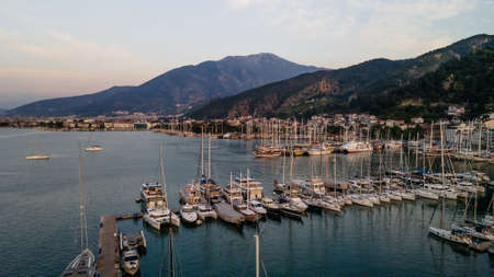 Beautiful Panoramic Aerial view at of boats, yacht, sailboat and bay in Marmaris, Turkey. Colorful landscape with boats in marina bay, sea, city, mountains