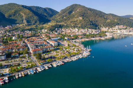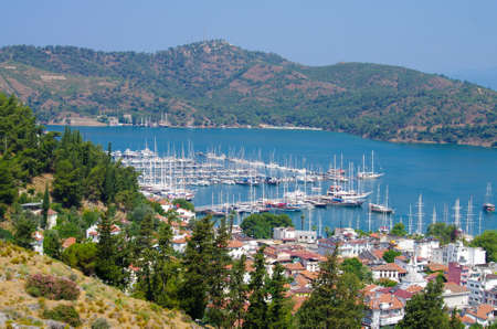 Gocek harbor, bay and city of skyline aerial view. Mediterranean coast, Fethiye TURKEY. High quality photo