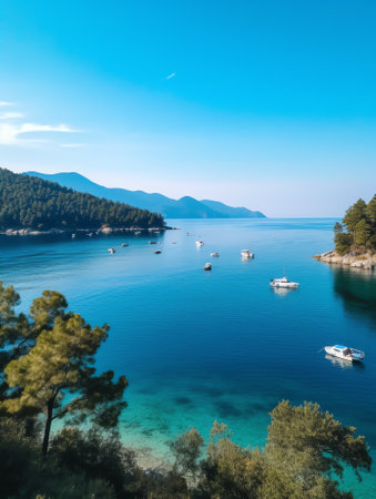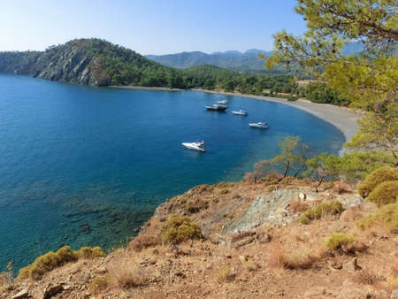 sarsala beach bay dalaman Mediterranean bay with hills and pine forest blue water and boats