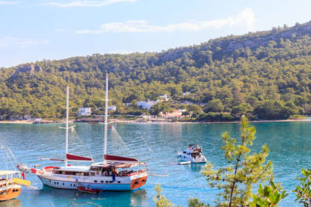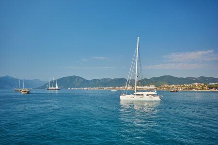White yachts in the beautiful blue sea, travel, recreation and vacation concept. Aegean Sea, Turkey, near Bodrum and Marmaris