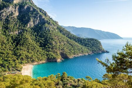 Beautiful scenery of bay and mountains and blue sky. Mediterranean sea coast. Nature of Turkey.