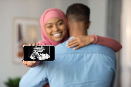 Happy Islamic Lady Showing Smartphone With Baby Ultrasound Image And Embracing Husband