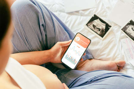 Pregnancy app. Mobile pregnancy online maternity application. Pregnant mother using phone. Pregnancy, medicine, pharmaceuticals, health care and people concept