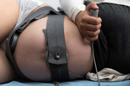 Close Up Pregnant Woman On Hospital Couch During Medical Control Cardiotocography. Visit Gynecologist Doctor At Clinic For Pregnancy Consultant. Examine Expectant Belly Baby Mother Healthcare Check Up