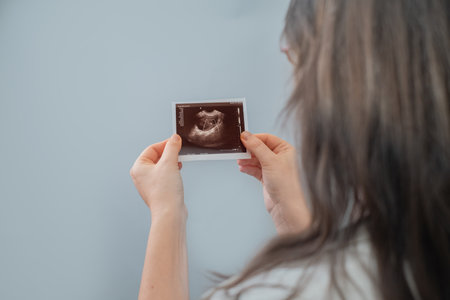 Close up of pregnant woman holding ultrasound scan on her tummy