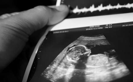 Prenatal ultrasound screening of unborn baby. Pregnancy background