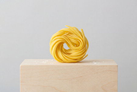 A single uncooked yellow tagliatelle pasta nest stands upright on a light wooden pedestal with scattered flour dust against a clean and neutral grey background.