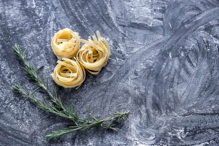 Concept of Italian food. Tagliatelle pasta on dark background. Directly above.
