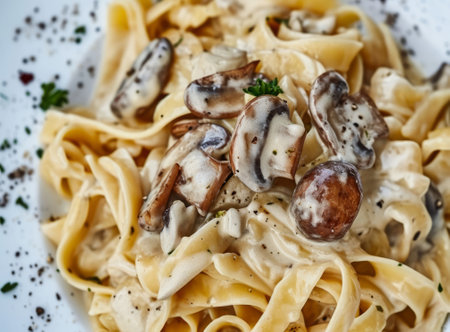 Pasta with mushrooms and cream sauce on a white background. Selective focus.