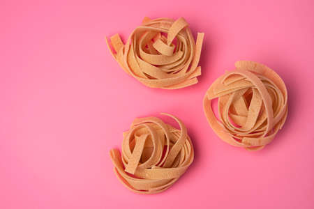 Three nests of Raw tagliatelle on a pink background, pasta nests, egg paste nests