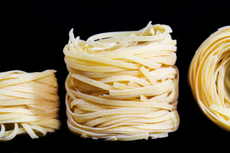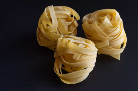 Italian pasta fettuccine nest on black background