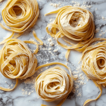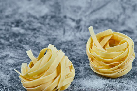 Uncooked tagliatelle pasta on a marble background