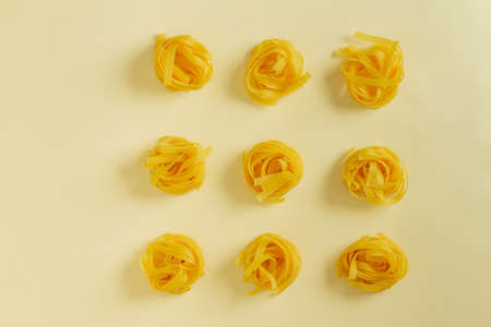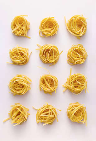 Raw tagliatelle , nest pasta, Egg pasta nests lying in a pattern on a white background
