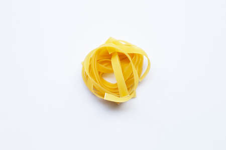 Italian wheat pasta tagliatelle isolated on white background. Top view, close-up.