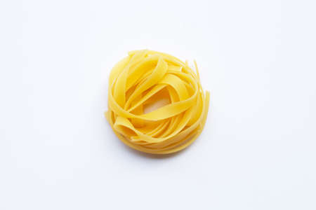 Uncooked Italian pasta tagliatelle nest on white background. Copy space