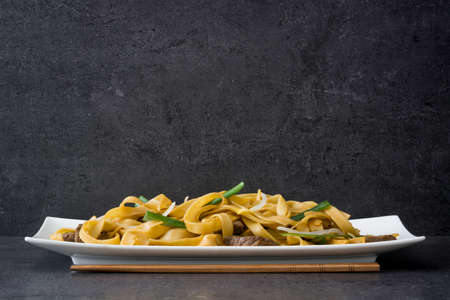 Chinese food. Beef chow mein on black stone background