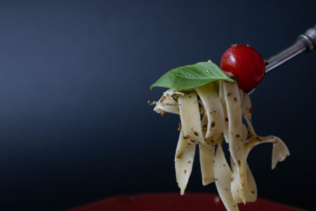 Pasta with pesto sauce and cherry tomato on a black background