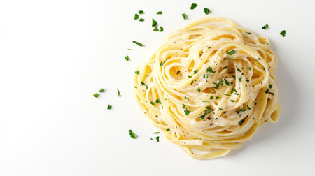 An elegant overhead shot of creamy fettucine styled with fresh herbs. Perfect for showcasing Italian cuisine, this image highlights delicious presentation.