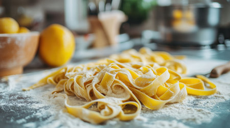 A traditional Italian kitchen with fresh pasta dough rolled out, ready to be cut into tagliatelle, with a dusting of flour.